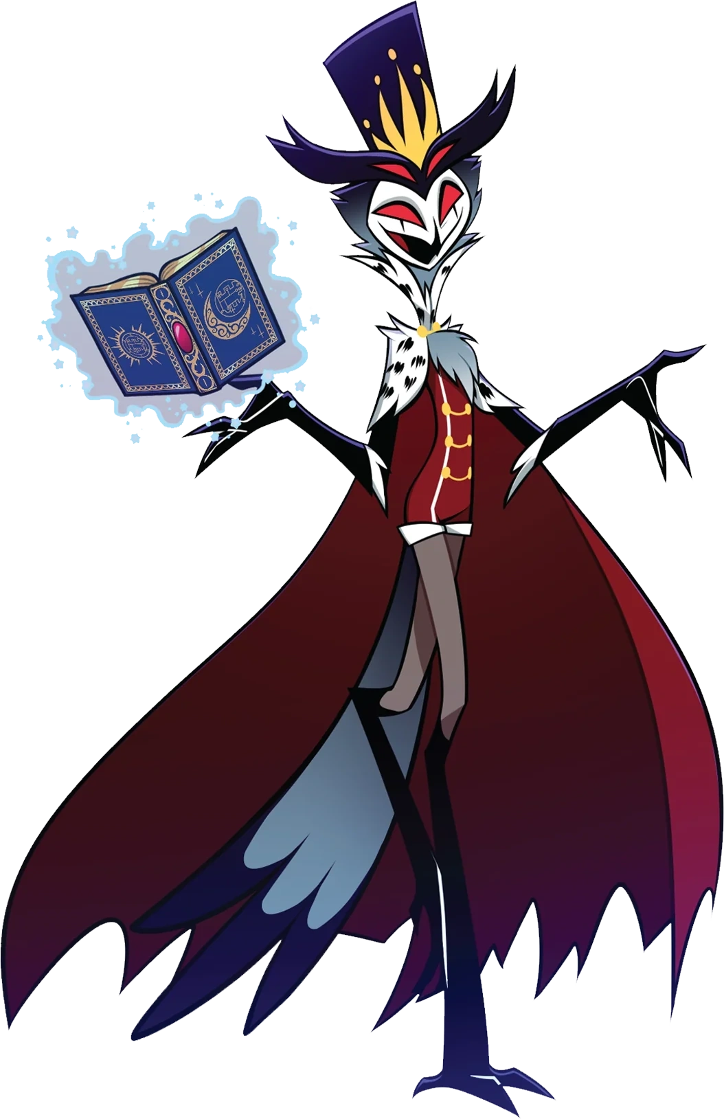 He is an extremely powerful demon prince who belonged to the Ars Goetia royal family. One night, he slept with an assassin imp named Blitzo, whom the latter had sex with in order to steal the former's arcane book, the Grimoire, which allows Blitzo and his assassination business the Immediate Murder Professionals (I.M.P) access to the mortal realm to do their job. Stolas allows I.M.P to keep the book on the condition that Blitzo continues to sleep with him.